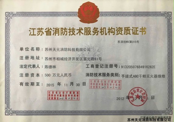 苏州天元消防科技有限公司主要经营消防设备及安保器材、苏州灭火器充装维修检测等。公司是经江苏省公安厅消防局认证的具有灭火器充装维修年检相关资质的企业。公司坚持“客户第一”的原则为广大客户提供优质的服务。欢迎来电洽谈,我们愿诚挚的为您服务! 我公司主要业务有灭火器等消防设备的生产、销售、 维修、加工、消防工程安装、调试、保养等消防相关服务。公司技术雄厚,设备先进,产品规格种类齐全,检测设备完善,拥有专业的消防工程技术人员,为您解除后顾之忧。 主要经营:干粉系列、二氧化碳系列、 1211系列、泡沫系列灭火器,各种规格的灭火器箱、消火栓箱、消火栓、水泵接合器、水带、接扣、 水枪,各种应急灯、疏散指示灯、呼吸器、防火服及个人装备等产品,并提供灭火器充装维修检测服务。为您提供消防安全一揽子的解决方案。 公司以“质量第一,诚信为本,服务周到”为宗旨,以一流的产品质量、一流的售后服务为您的事业保驾护航!